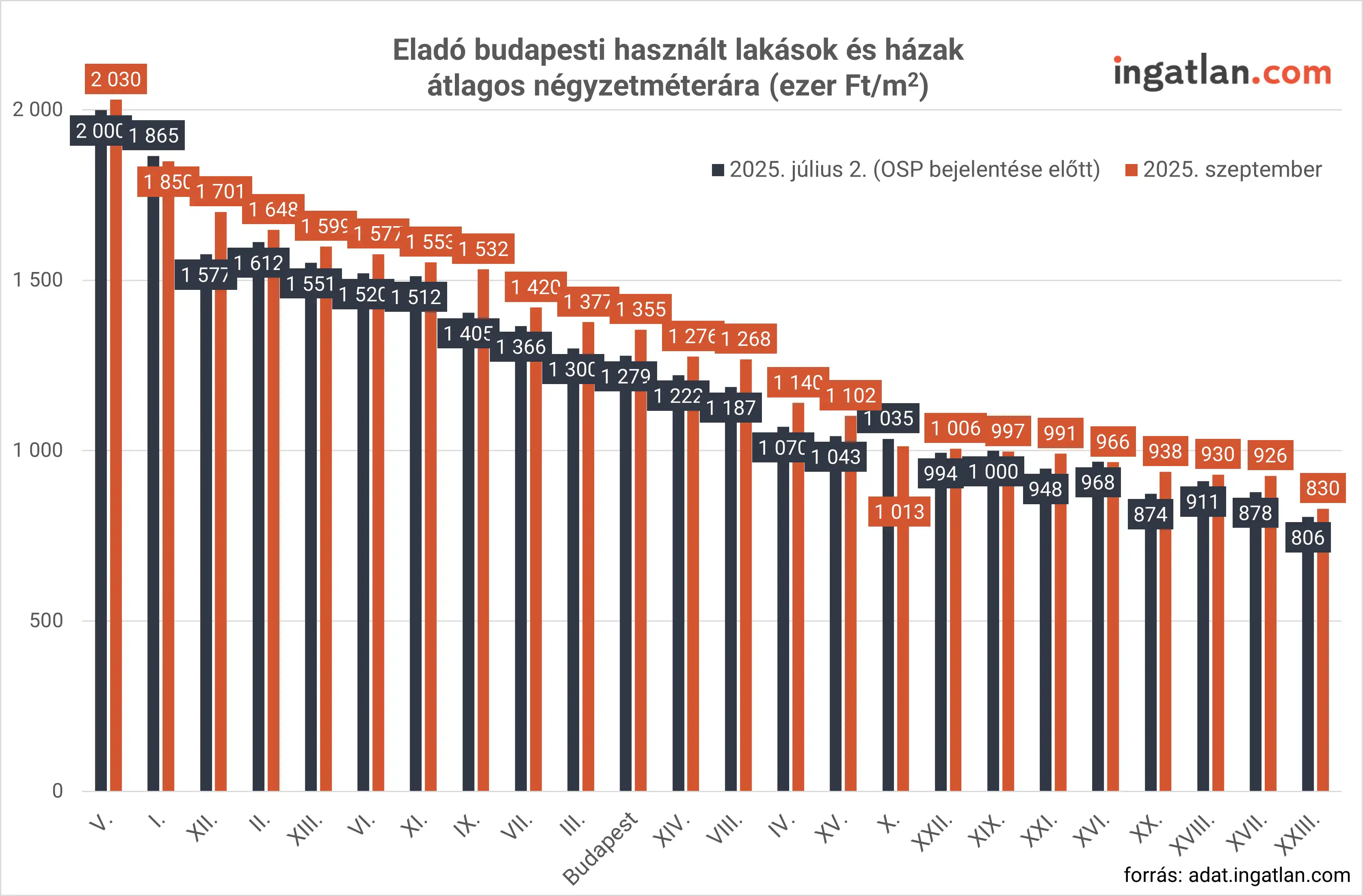 A szeptember eleji kínálat alapján Budapesten a legtöbb eladó ingatlan a XIII. kerületben található, több mint 2600 lakással és házzal, ezt követi a VII. kerület 2 100-zal, a VI. kerület 2 000-rel, a II. kerület 2 050-nel, valamint a VIII. kerület 1700 körüli eladó ingatlannal. Ha az Otthon Start programban elérhető kínálat arányát nézzük, akkor a XVIII. kerület emelkedik ki, ahol az összes eladó ingatlan 76 százaléka tartozik ide. A VIII. kerületben ez az arány 56 százalék, a XIV. kerületben 56 százalék, a VII. kerületben 41 százalék, a XIII. kerületben pedig 27 százalék.