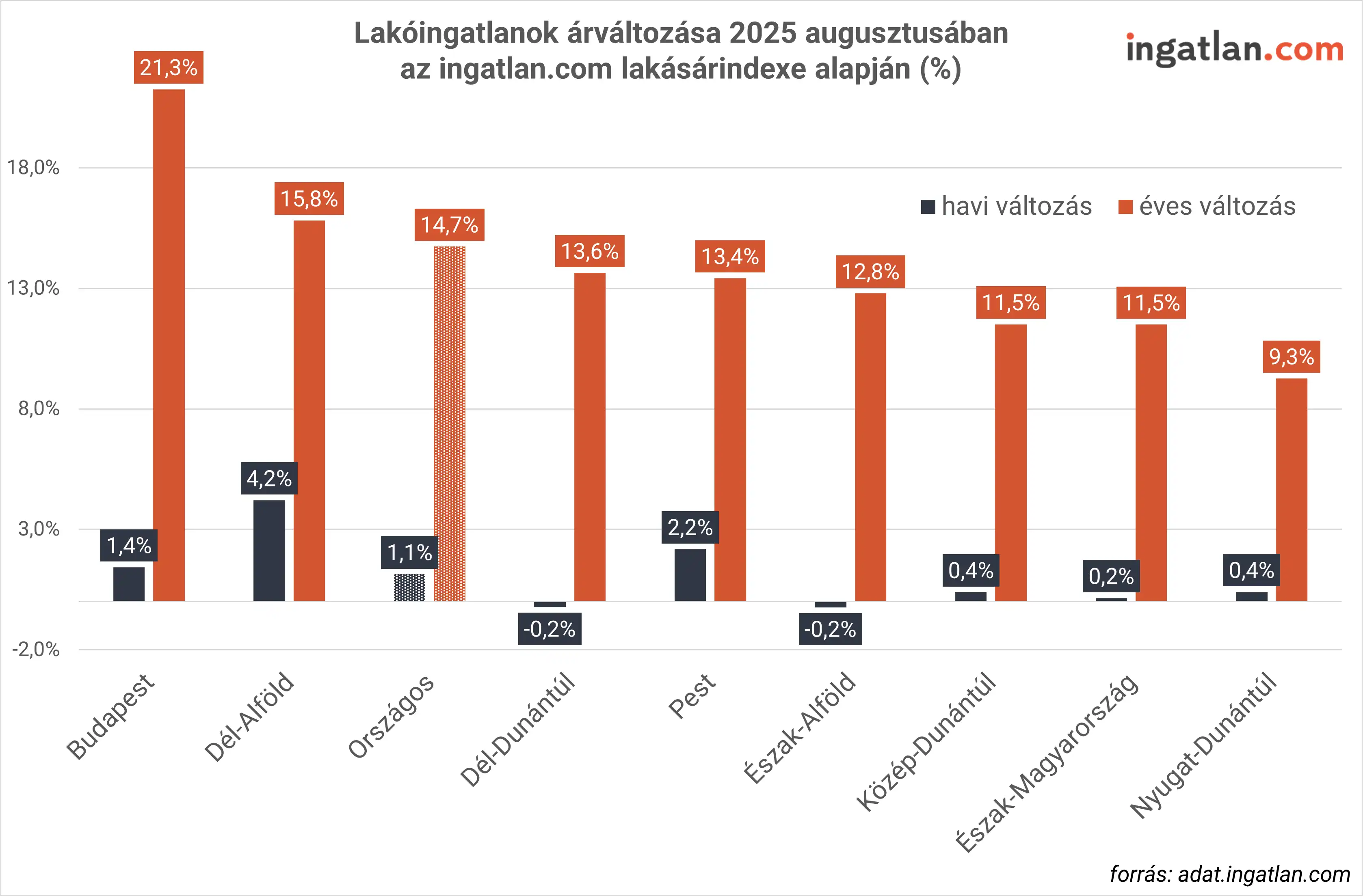 A régiók között jelentős különbségek figyelhetők meg. Havi összevetésben a Dél-Alföldön kiugró, 4,2 százalékos drágulás következett be augusztusban, Pest vármegyében 2,2 százalékos volt a havi áremelkedés. Ezzel szemben a Dél-Dunántúlon minimális, 0,2 százalékos árcsökkenés történt.