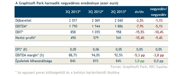Ha eltekintünk az egyszeri pozitív hatást jelentő bevételtől, akkor mind éves, mind pedig negyedéves alapon csökkent az eredmény a Graphisoft Parknál a harmadik negyedévben. Az árbevétel éves alapon 2,5 százalékkal mérséklődött, míg az egyszeri tételtől tisztított EBITDA 7,9 százalékkal csökkent. Az árbevételt és ennél fogva az eredményt is az AMRI távozása miatt kieső díjbevétel húzza lefele.