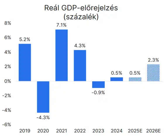 Jövőre végre beindulhat a magyar gazdaság. Az Európai Unió és az Egyesült Államok között megszülető vámmegállapodás, valamint a német gazdaság várt élénkülése kedvezőbb külső környezetet eredményezhet. A csökkenő bizonytalanság és a magyar exporttermékek iránti keresletet növekedése a várva várt beruházási fordulatot is elhozhatja. Mindezek eredményeként a GDP 2,3 százalékkal bővülhet 2026-ban. Idén azonban még stagnál a magyar gazdaság teljesítménye. Az Erste elemzői az első hónapokban prognosztizált 2 százalékkal szemben most már legfeljebb 0,5 százalékos GDP-növekedést várnak 2025-re. Jelenleg a hazai gazdaságot itthon csak a háztartások fogyasztása támogatja, a beruházások és az export visszahúzzák a növekedést.