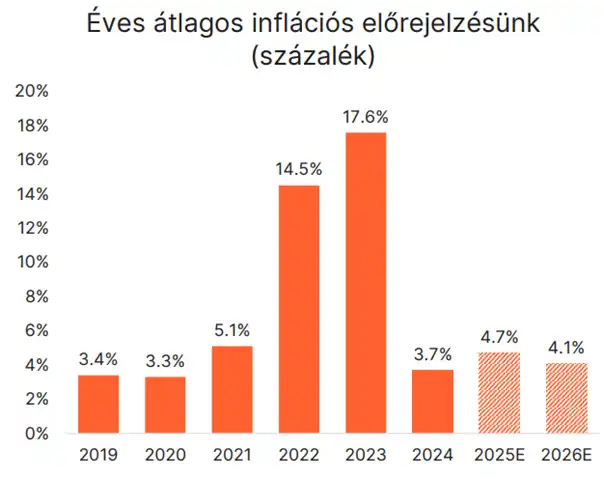 Az árrésstopnak és a viszonylag erős forint árfolyamnak köszönhetően csökkent az infláció mértéke az év első felében, és rövid távon a kockázatok is kiegyensúlyozottabbá váltak. Ugyanakkor a globális élelmiszer- és a hozzá kapcsolódó nyersanyagárak emelkedése, valamint a belföldi gazdák esetében előbb a fagy, majd az aszály okozta károk a mezőgazdasági termelői árak masszív emelkedését eredményezik. Mindez, a magas szinten ragadt lakossági inflációs várakozásokkal kiegészülve, hosszabb távon a felfelé mutató kockázatokat erősítik. A pénzromlás üteme így idén az év elején prognosztizált 5,5 százalékkal szemben 4,7 százalék lehet. Jövőre az áremelkedés üteme tovább lassulhat 4,1 százalékra, ugyanakkor bizonytalanságot jelent az árrésstop vélhetően 2026-os kivezetése, így az infláció vélhetően csak 2027-től tér vissza a jegybanki célsávba.