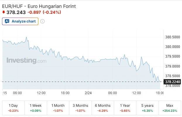 Az euró jegyzése este hat órára 378,46 forintra csökkent a reggel hét órai 379,36 forintról, a dollárt 321,05 forinton jegyezték 322,08 forint után, a svájci frank pedig 415,05 forinton állt 415,17 forint után.