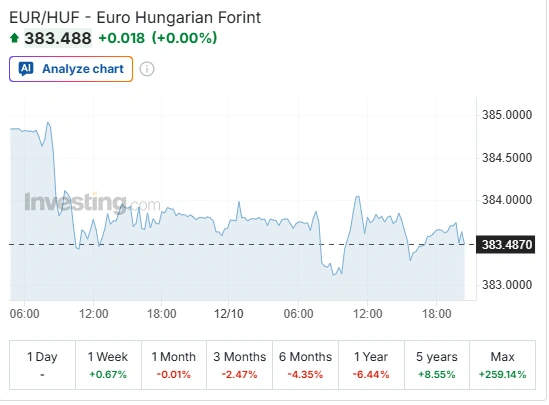 Az euró árfolyama a reggel hat órakor jegyzett 383,67 forintról 383,61 forintra csökkent 18 órakor, napközben 383,06 forint és 384,22 forint között mozgott.