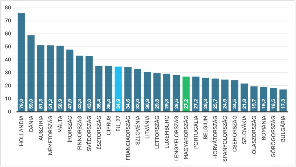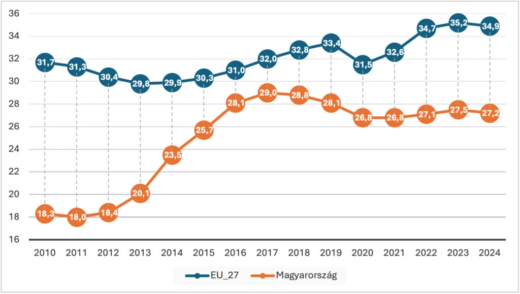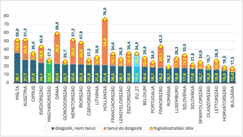 Hazánkban a 15–24 évesek foglalkoztatási rátája 9 százalékponttal emelkedett az utóbbi másfél évtizedben, a 2024. éves adatunk 27,2%, ugyanekkor az Európai Unió átlaga 34,9%, az OECD átlaga pedig 43,2%.