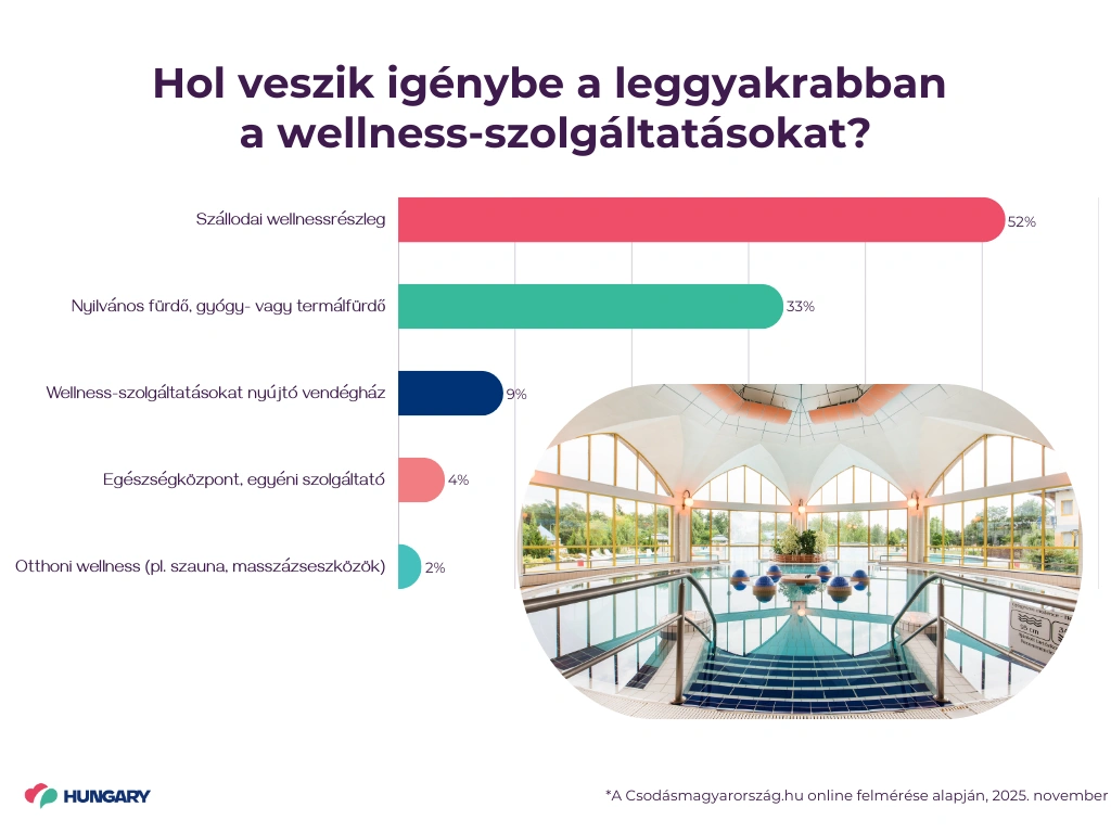 A válaszok alapján a szállodai wellnessrészlegek a legnépszerűbbek, ezeket a kitöltők 52 százaléka választja pihenés céljából. A nyilvános fürdők – legyen szó gyógy-, termál- vagy élményfürdőkről – a résztvevők egyharmada (33 százalék) számára jelentenek vonzó alternatívát. Wellness-szolgáltatást kínáló vendégházakba 9 százalék látogat, míg egészségközpontokat vagy egyéni szolgáltatók által működtetett részlegeket 4 százalék keres fel. Az otthoni wellnessmegoldások ezzel szemben csupán a válaszadók 2 százalékára jellemzők.