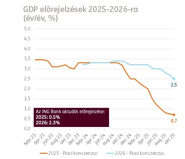 Az ING Bank előrejelzése szerint jövőre a magyar gazdaság 2,3 százalékkal bővülhet, ami elsősorban a reálbérek emelkedése által hajtott lakossági fogyasztásnak lesz köszönhető. Virovácz Péter azonban figyelmeztetett: „Ez a növekedés törékeny lábakon áll. A beruházási aktivitás az üzleti bizalom hiánya és a szűkös költségvetési mozgástér miatt gyenge marad, miközben az ipar sem mutat egyértelmű kilábalást a stagnálásból.”