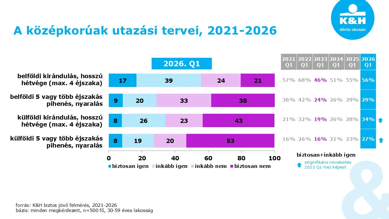 Élénkülést mutat a középkorúak utazási kedve: a belföldi utak aránya ugyan még nem érte el a 2022-es szintet, a külföldi utazások iránti érdeklődés viszont évről évre erősödik a K&H biztos jövő indexe szerint, amely az első negyedévben a 30-59 évesek idei terveit térképezte fel.