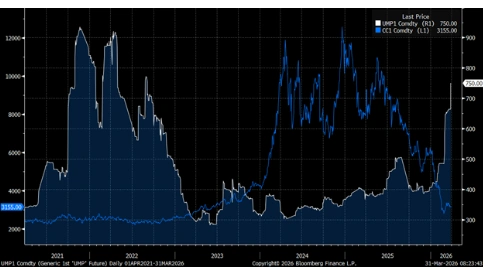 A kakaó (kék vonal, bal tengely) és a tej (fehér vonal, jobb tengely) árának alakulása 2020 és 2026 között.