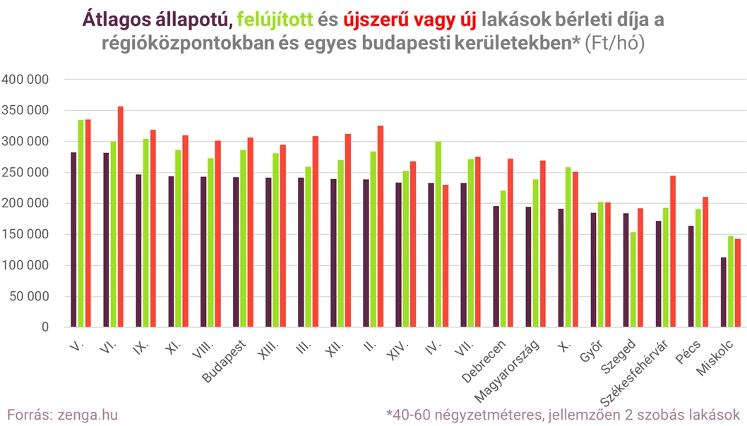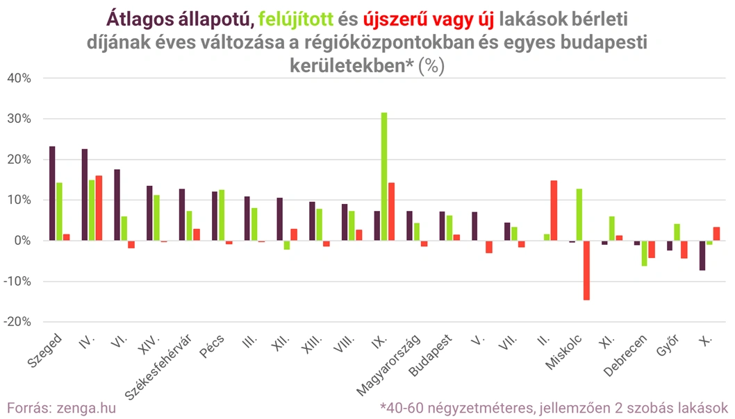 “Az átlagos állapotú lakások bérleti díjait jobban tudták emelni a bérbeadók, mint az új vagy újszerű lakásokét. Az olcsóbb, de kevésbé jó állapotú lakásokra feltehetően nagyobb volt a bérlői kereslet, mint a valamivel drágább, de jobb állapotú lakások iránt” - mondta Futó Péter, a zenga.hu elemzési vezetője.
