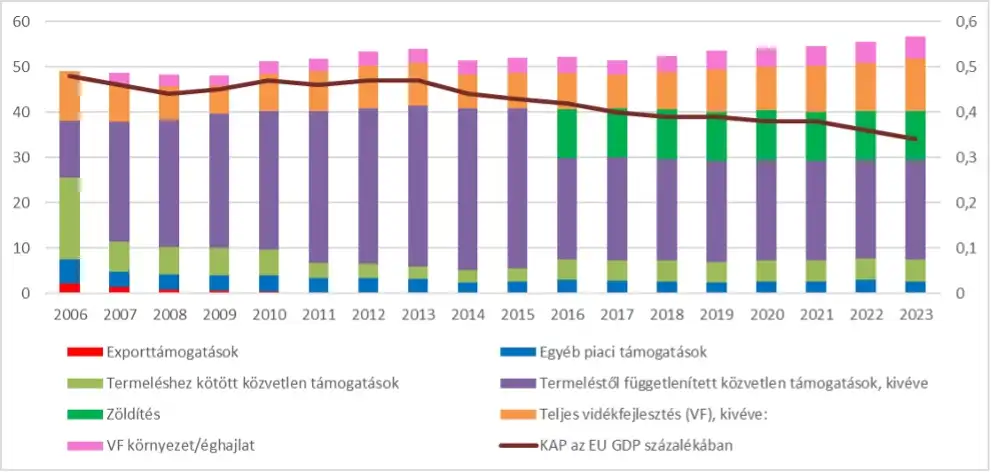 Ez rendben is volna, ám ha mindezt egy tágabb kontextusba helyezzük, látható, hogy az évtizedek során az EU teljes költségvetésének egyre kevesebb százalékát szánják a politikai döntéshozók a KAP támogatására. A különböző zöldítési és környezetvédelmi programok miatt ugyan részesülnek a gazdák támogatásban – ám a támogatások összege már évek óta nem emelkedett, miközben a szabályok egyre szigorúbbak, így a gazdák egyre nehezebb helyzetben találják magukat. Mi több, a támogatások ellenére, az uniós mezőgazdaság képtelen elérni a kitűzött zöldítési célokat.