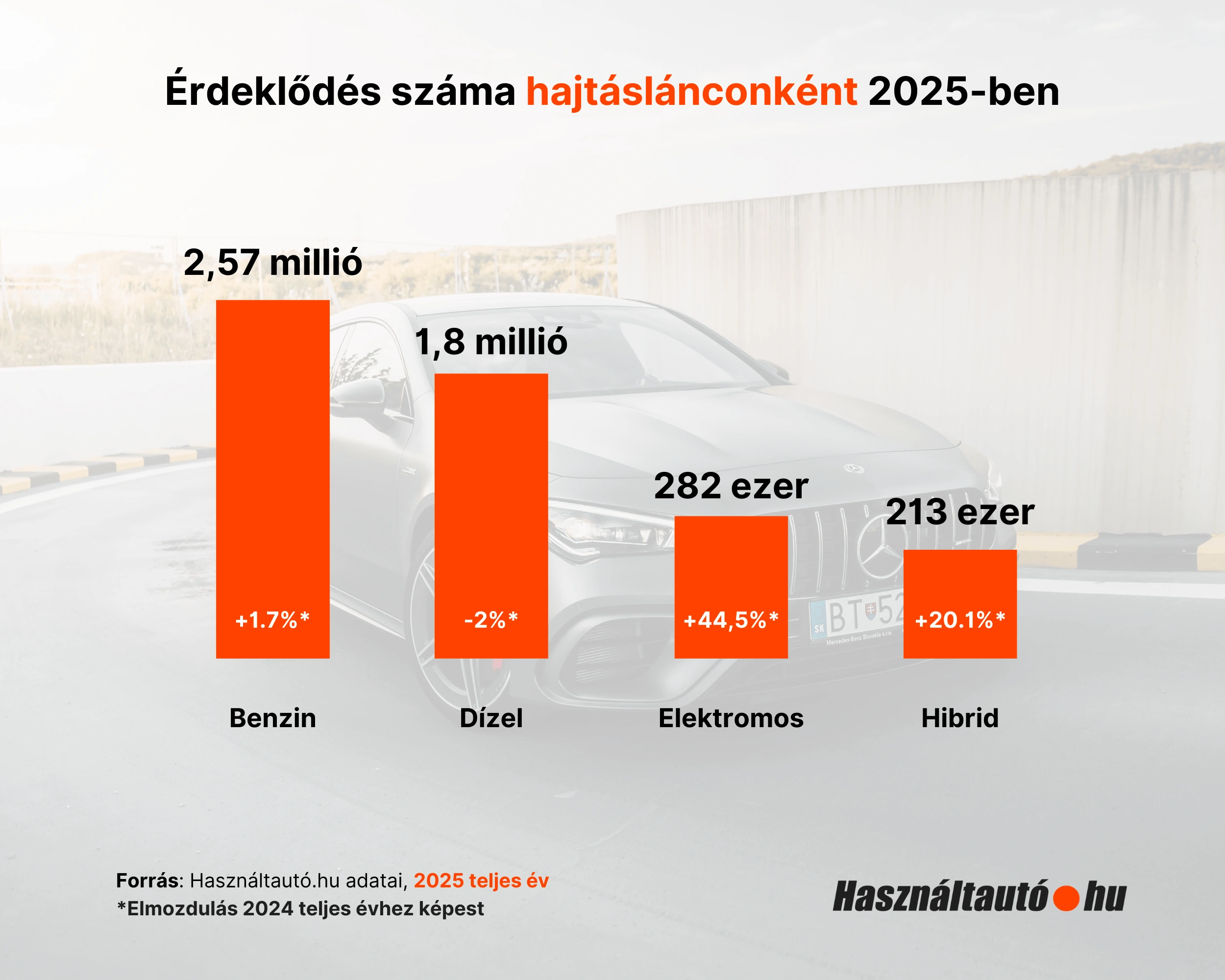 A kereslet növekedésének döntő része az alternatív hajtású járművekhez kötődött. Az elektromos autók iránti érdeklődés egyetlen év alatt 44,5%-kal nőtt, míg a hibrideknél 20,8%-os bővülés volt megfigyelhető. Együttesen több mint 123 ezerrel nőtt az elektromos és hibrid modellekhez kapcsolódó érdeklődések száma, ami önmagában szinte lefedi a teljes piac éves növekményét.
