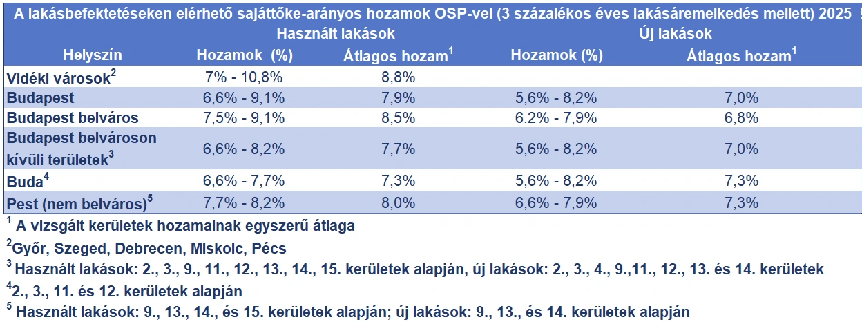 Budapesten a vizsgált helyszínek közül a használt lakások esetében – piaci hitel felvétele mellett – Pest belvárosában a legmagasabb a sajáttőke-arányos nyereség: a 7. kerületben 5,5, míg a 8. kerületben 5,7 százalék volt a kalkulált hozamszint. A vidéki városok közül Miskolcon a legmagasabb a sajáttőkearányos nyereség (7,4%), de 5 százalék felett mozgott Győrben, Debrecenben és Pécsen is. Az új lakások esetében a fővárosban 2,2 és 4,8 százalék közötti hozamszintek jellemezők, a legmagasabb nyereség a 3. kerületben, Budán volt mérhető.