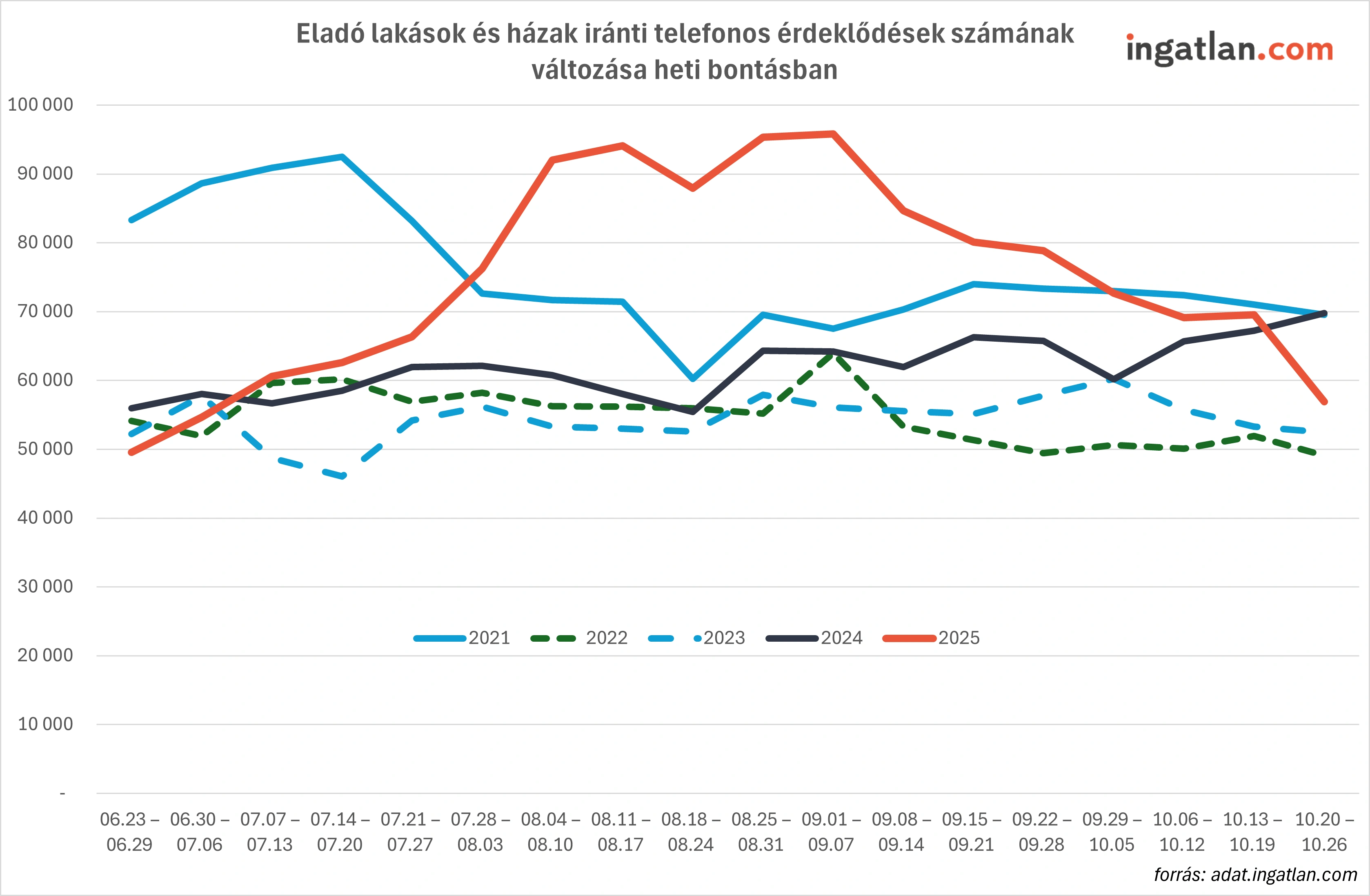 „Október 13-19 között az eladó lakások és házak iránti telefonos érdeklődések száma csökkent az előző hetekhez képest, mivel az augusztusi és szeptemberi heti átlagokhoz képest 20 százalékkal esett vissza a kereslet. A lecsengésnek vannak természetes okai is, mivel az év vége közeledtével a lakásvásárlói aktivitás mindig alábbhagy.