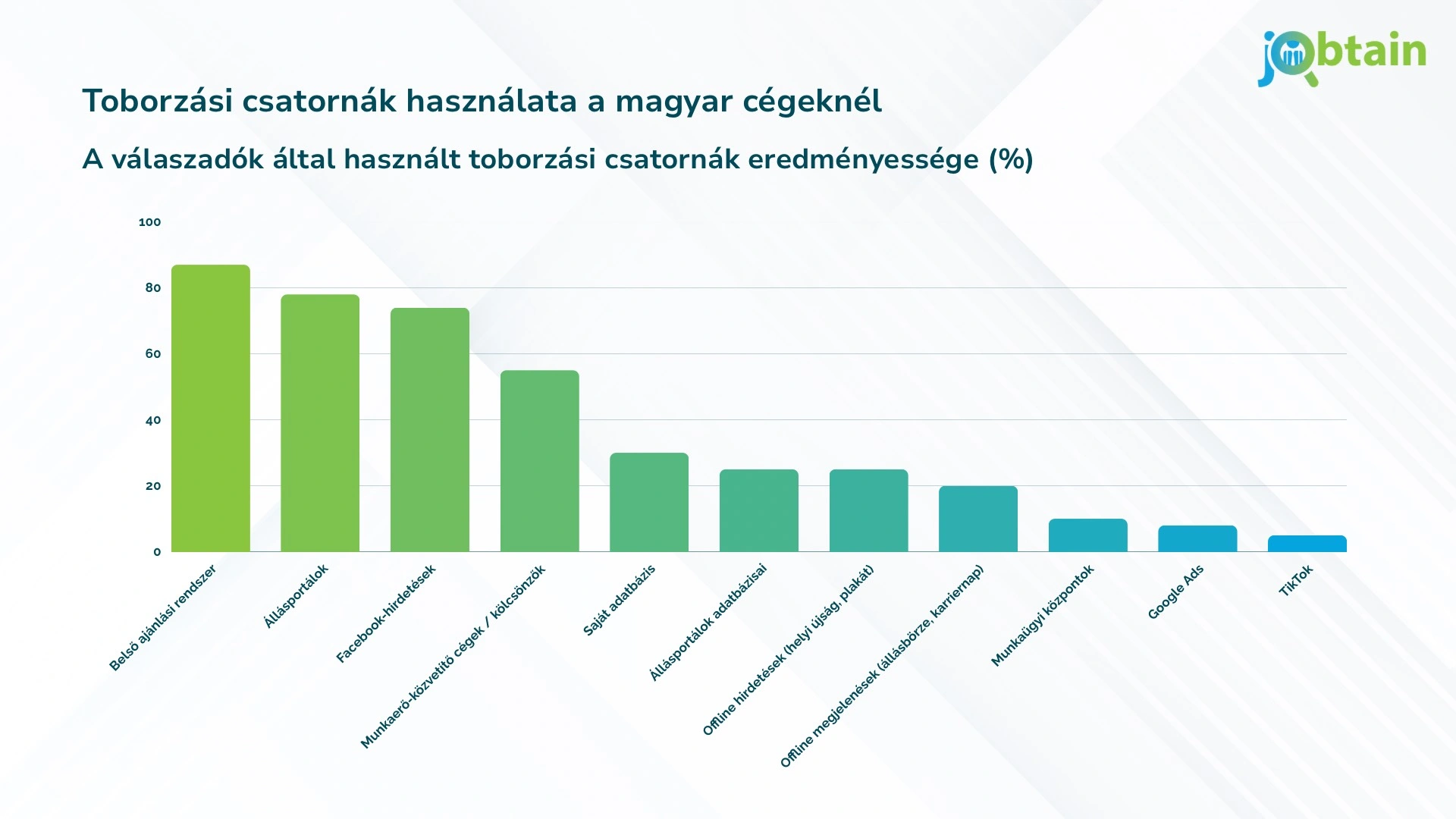A kutatás rámutat, hogy a cégek egyre tudatosabban keresik a hosszú távra tervező, stabil munkavállalókat. Ugyanakkor 36%-uknál mégsincs rendszer a toborzás minőségének mérésére, és sok helyen hiányzik a dolgozók fejlődési potenciáljának feltérképezése is. A megbízható munkaerő megtalálása mellett a kapcsolatok minősége is döntő fontosságú. A belső ajánlási rendszerek a leghatékonyabb toborzási csatornák (87%), ami azt mutatja, hogy a személyes kapcsolatok, a munkatársi bizalom és az ajánlások szerepe kulcsszerepet játszik a sikeres kiválasztásban. „A jó munkahely nemcsak stabil fizetést, hanem stabil kapcsolatokat is kínál. Ha a dolgozó érzi, hogy számít, ha van kihez fordulnia, az biztonságot ad – és ez az igazi lojalitás alapja. A megbízhatóság tehát nemcsak elvárás, hanem kölcsönös viszony: a munkavállaló akkor lesz megbízható, ha a munkáltató is az” – tette hozzá Mihályi Magdolna.