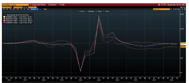 1. ábra: az Egyesült Királyság, Franciaország, Németország és az eurózóna GDP-je 2016 óta, normalizálva.