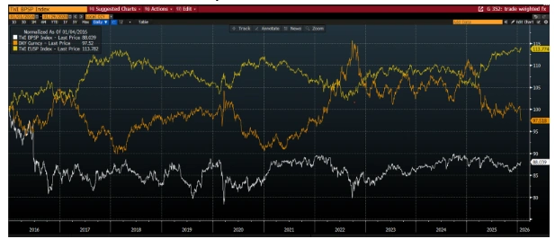 2. ábra: kereskedelemmel súlyozott GBP, EUR és DXY index, normalizálva.