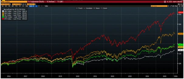 3. ábra: FTSE 100, CAC, DAX, Euro Stoxx 50 és S&P 500 – normalizálva az elmúlt 10 évre.