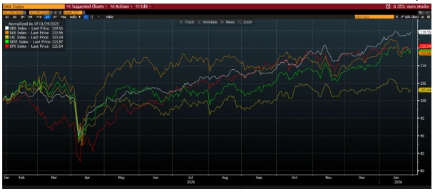 4. ábra: FTSE 100, CAC, DAX, Euro Stoxx 50 és S&P 500 – normalizálva az elmúlt 12 hónapra.