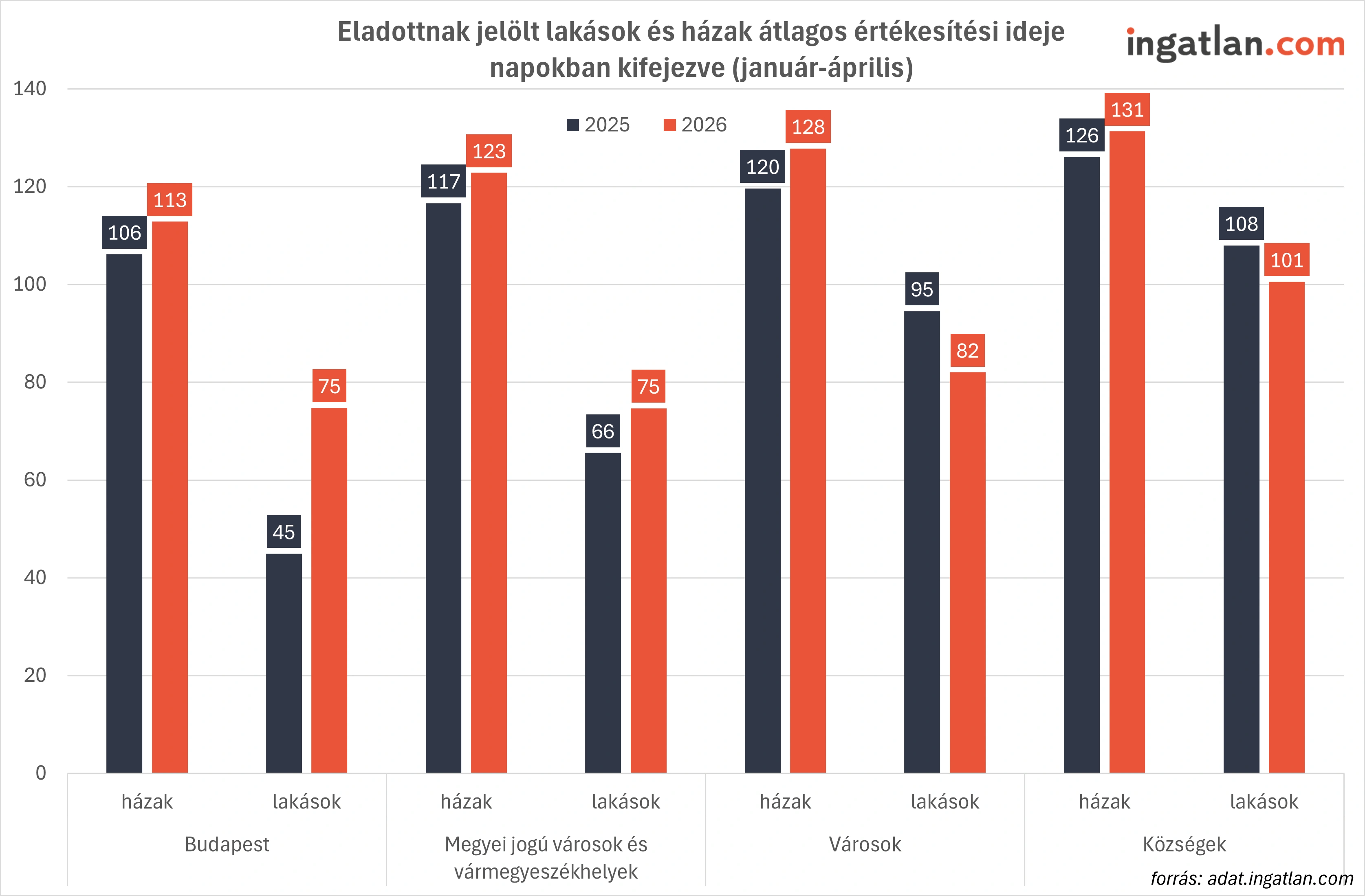 A kisebb városokban és a községekben ugyanakkor eltérő kép látszik. A városokban a lakások eladási ideje 95 napról 82 napra csökkent, a községekben és nagyközségekben pedig 108 napról 101 napra mérséklődött. A házaknál viszont ezekben a településtípusokban is lassabb piac rajzolódik ki: a városokban 120 napról 128 napra, a községekben és nagyközségekben 126 napról 131 napra nőtt az átlagos értékesítési idő.