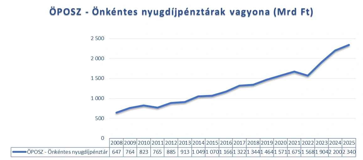 A pozitív hozamoknak és a növekvő befizetéseknek köszönhetően a pénztárak által kezelt összesített tagi vagyon 2025 végére új csúcsra emelkedett, meghaladva a 2,34 ezer milliárd forintot, ami 6,4 százalékos bővülést jelent az egy évvel korábbihoz képest.