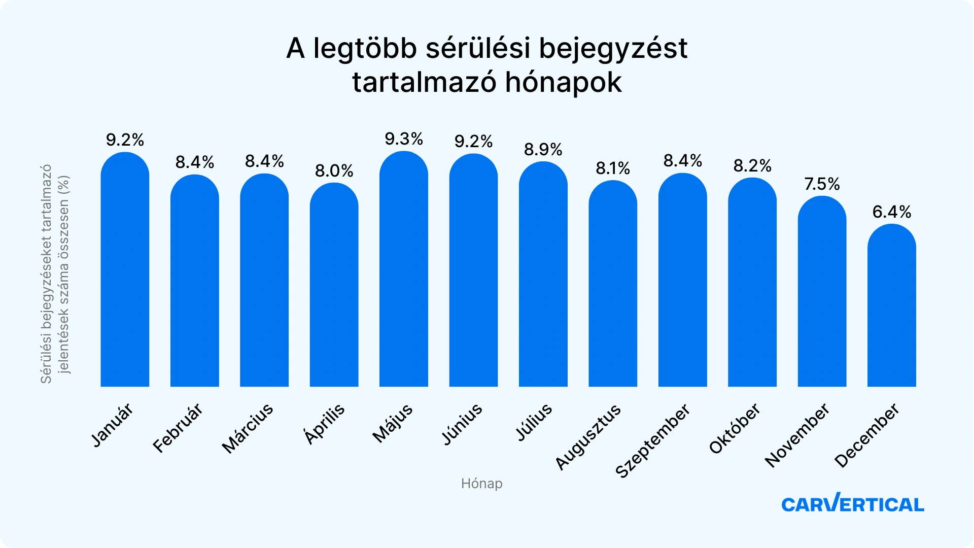 Magyarországon a legtöbb kárbejegyzést májusban (9,3%), januárban (9,2%) és júniusban (9,2%) rögzítették, míg a legkevesebbet decemberben (6,4%), novemberben (7,5%) és áprilisban (8%) jegyezték fel.