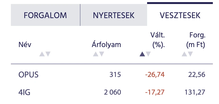 A 4iG sem kerülte el a negatív hangulatot: a vállalat papírjai 2060 forintos szinten nyitottak, ami 17,27%-os csökkenést tükröz. A két meghatározó cég együttes gyengülése érdemben befolyásolhatja a teljes magyar részvénypiac rövid távú megítélését.