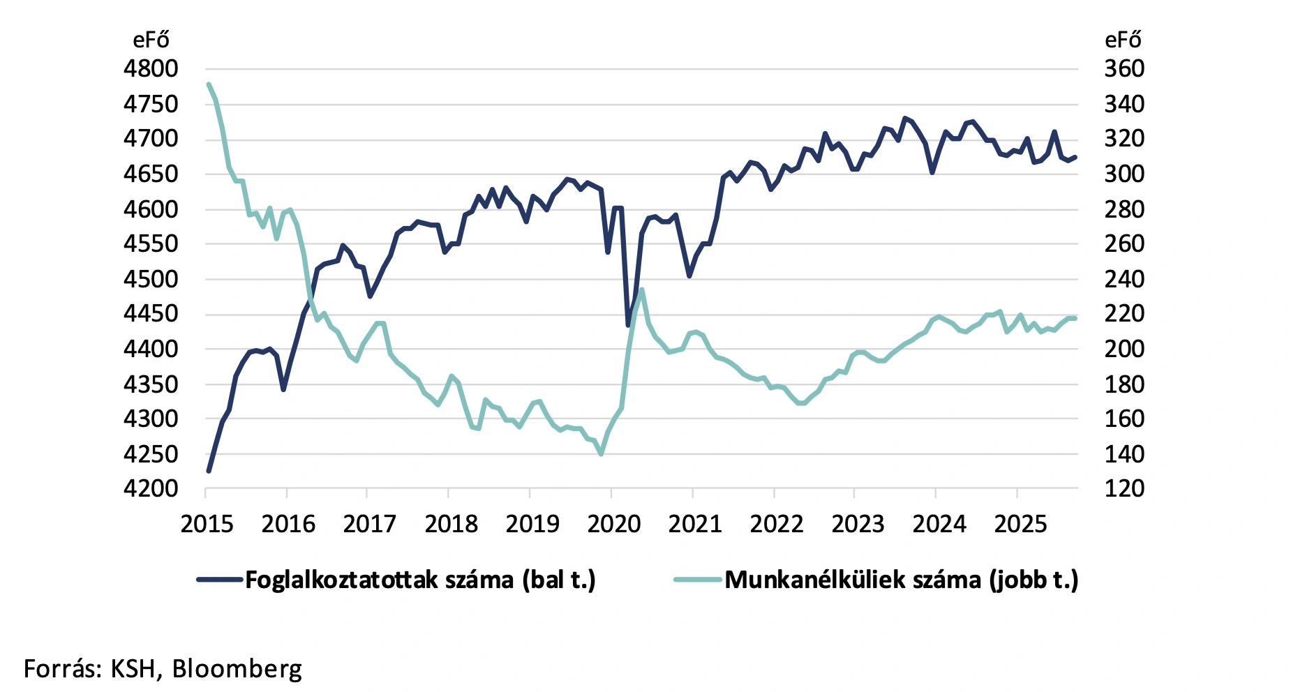 A háromhavi adatok alapján, 2025. augusztus-október között a foglalkoztatottak átlagos létszáma a 15–74 évesek körében 4 millió 672 ezer fő volt, ami alacsonyabb a megelőző három hónapnál és az egy évvel ezelőtti szintnél is. A munkanélküliségi ráta októberben 4,4%-ra csökkent, ami kedvezőbb a konszenzus és az általunk várt 4,5%-nál, de a háromhavi mozgóátlag 4,6%-ra emelkedett. A mozgóátlag értéke megegyezik a tavaly ilyenkor látottakkal. A munkanélküliek száma nagyjából 500 fővel csökkent. A Nemzeti Foglalkoztatási Szolgálat nyilvántartásai alapján október végén a regisztrált álláskeresők száma 220,8 ezer fő volt, ami 2,4%-os csökkenés az egy évvel korábbihoz képest, de 0,3%-os növekedés szeptemberhez viszonyítva. A foglalkoztatók 28,7 ezer üres álláshelyet jelentettek be októberben, ami havi szinten 6%-os növekedést jelent.