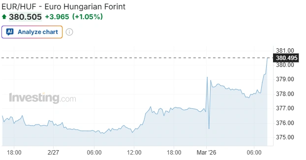 Az euró 7 órakor 377,86 forinton állt, magasabban a péntek esti 377,04 forintnál. Hétfőn az euró eddigi napi csúcsa 379,20 forint volt.