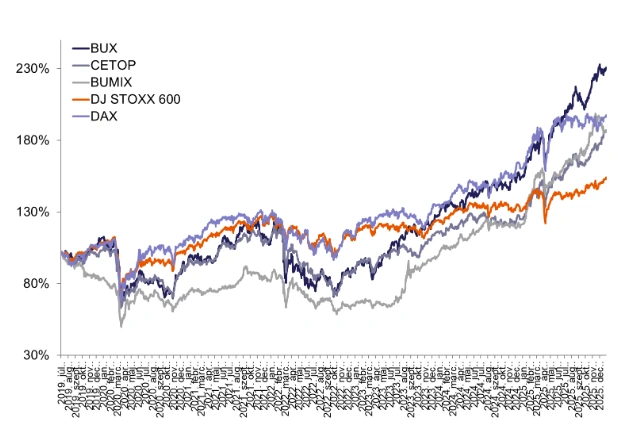 2025 a magyar részvénypiac szempontjából is kiemelkedő évet jelentett. A BUX mellett a BUMIX is 40 százalék feletti emelkedést produkált és mindkét index rekord értéket ért el az évben, míg a CETOP NTR 56 százalékos, az Xtend piac indexe pedig 15 százalékos gyarapodással zárta az évet. Nemzetközi összevetésben a magyar tőzsde dollárban számolva is az élmezőnybe került, ami tovább erősítette a Budapesti Értéktőzsde nemzetközi láthatóságát és befektetői megítélését.