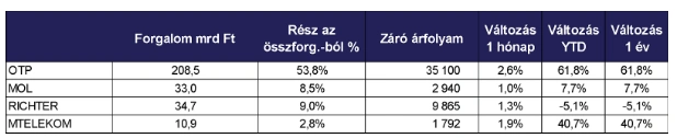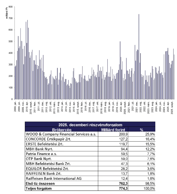 A részvénypiaci forgalom gerincét 2025-ben is az OTP Bank, a MOL és a Richter Gedeon adta, őket a Magyar Telekom követte, az ötödik helyet pedig a 4iG szerezte meg. Decemberben szintén az OTP részvényei forogtak a legnagyobb értékben a piacon 208,5 milliárd forint értékben, éves szinten az OTP papírjainak 61,8 százalékos emelkedése és rekord értéke jelentős hatással volt a BUX teljesítményére. Továbbá, a 4iG árfolyama az év során több mint háromszorosára emelkedett, amivel az egyik legjobban teljesítő kibocsátónak bizonyult a versenyben.