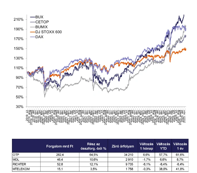 Az elmúlt időszakban több hazai nagyvállalat is közzétette harmadik negyedéves eredményeit, ami élénkebb kereskedést hozott. Novemberben a nemzetközi tőzsdék teljesítménye vegyes képet mutatott, de összességében pozitív hangulat jellemezte, különösen az Egyesült Államokban és a fejlett piacokon az év végi rally reményében.