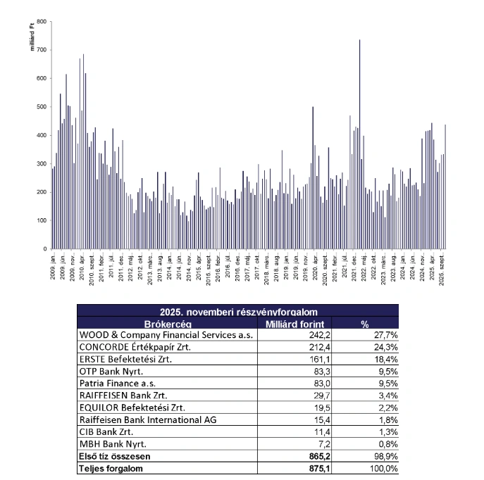 A brókercégek versenyét novemberben is a WOOD & Company vezette 242,2 milliárd forinttal, a második és harmadik helyen a Concorde és az ERSTE végzett 212,4 és 161,1 milliárd forinttal.