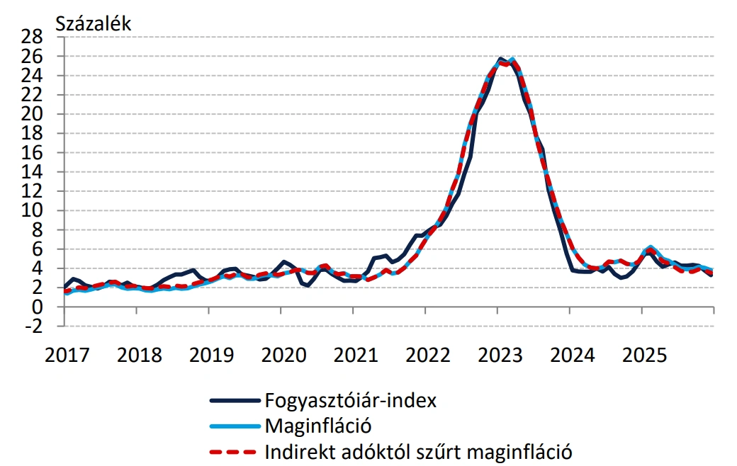 A külső környezet és a forint erősödése segíti a dezinflációt. Az MNB kiemelte, hogy "a külső költségkörnyezet általános javulása, valamint az erősebb forint beszerzési árakban való megjelenése támogatja a dezinflációt. Ugyanakkor az év eleji vállalati átárazások alakulása bizonytalanságot hordoz az inflációs kilátásokra nézve. Prognózisunk szerint az áremelkedés üteme 2026 elején ideiglenesen a 3 százalékos inflációs cél alá mérséklődik, majd átmenetileg a toleranciasáv felső széle közelébe emelkedik. Az inflációs cél 2027 második felében érhető el fenntarthatóan. A Monetáris Tanács értékelése szerint az inflációs kilátásokat kiegyensúlyozott kockázatok övezik. A devizapiac stabilitásának fenntartása kulcsfontosságú az inflációs várakozások mérséklésében."
