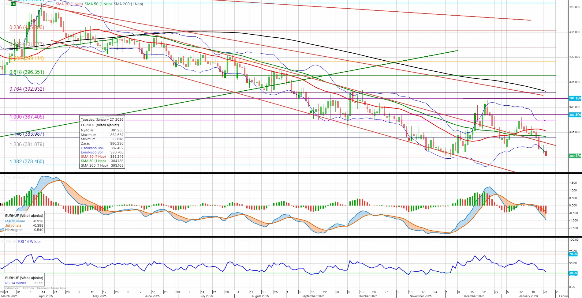 Meghatározó támasz felé közelít az euró-forint árfolyama. Az elmúlt napokban ismét csökkenés indult az árfolyamban, rendkívül fontos támasz 380 közelében húzódik, mely tavaly decemberben megállította a forint erősödését. Amennyiben letörésre kerülne, 378,50-nél adódna a következő támasz, míg felül 383-nál látszik az első komolyabb ellenállási szint.