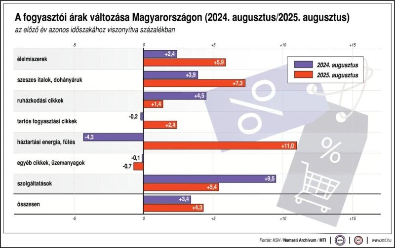 A Központi Statisztikai Hivatal (KSH) adatai alapján 2025 augusztusában az infláció mértéke az előző év azonos időszakához képest 4,3 százalék volt, az előző hónaphoz képest pedig nem változtak az árak. Az élelmiszerinfláció mértéke éves alapon 5,9 százalékot tett ki, míg júliushoz képest nem történt emelkedés. Ezen belül vizsgálva, a hidegélelmiszerek esetében, azaz a vendéglátási szolgáltatások nélkül számítva éves alapon 4,7 százalékkal emelkedtek, az előző hónaphoz képest pedig 0,1 százalékkal mérséklődtek az árak.