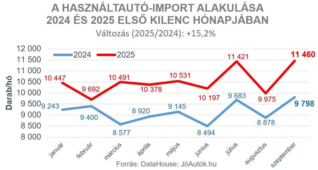 A használtautó-import mennyisége 2025 első három negyedévében összesen 94 592 volt, ami 15,2 százalékkal haladja meg az előző év hasonló időszakában regisztrált 82 138-as értéket. Ugyanebben az időszakban az újautó-eladások száma 95 946 volt, ami 7,7 százalékkal múlja felül az egy évvel korábbi 89 050-es mennyiséget.