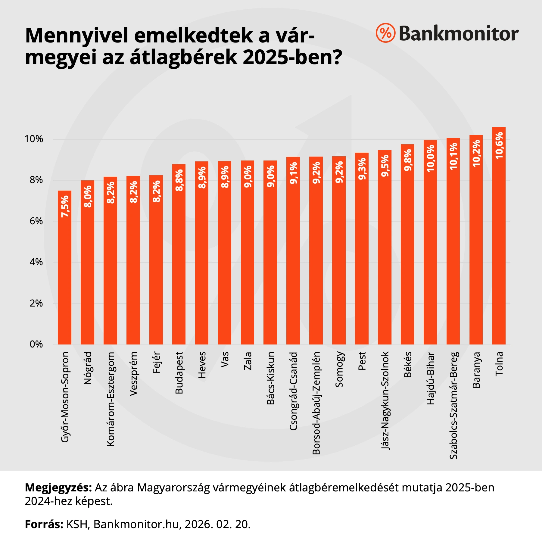 A Budapest és vidék közötti bérszakadék folyamatosan szűkül. Míg 2019-ben a legalacsonyabb bruttó átlagkeresettel bíró Szabolcs-Szatmár-Bereg megye bérszínvonala a budapestinek csupán 55,6 százalékát érte el, ez az arány 2025-re 61,5 százalékra emelkedett. Tehát az alacsonyabb átlagbérekkel rendelkező vármegyék felzárkózási folyamata, ha tyúklépésben is, de halad.