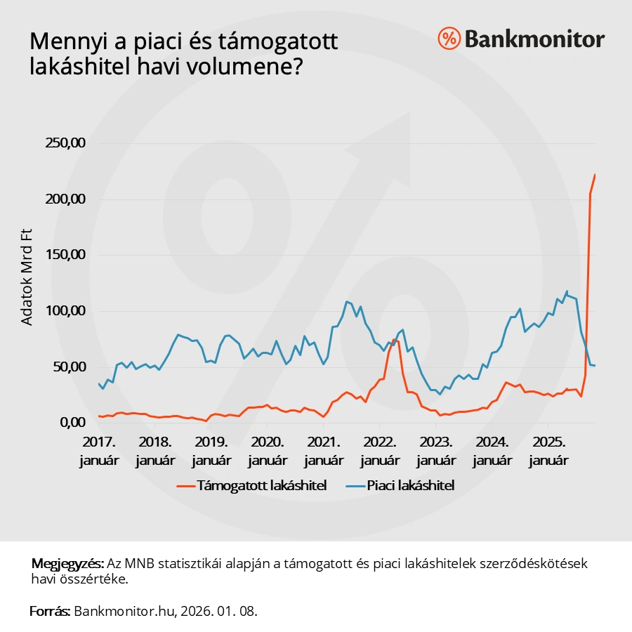 A felfutásnak nincs semmilyen meglepő oka, elindult az Otthon Start program és emiatt érdemben megugrott a hiteligénylések száma. Ezt a statisztikai adatok is visszatükrözik, a teljes novemberi szerződéskötési állományból ugyanis 222,64 milliárd forint kapcsolódott támogatott hitelhez. Ebből nagyságrendileg 200 milliárd forint lehetett Otthon Start, a maradék pedig CSOK Plusz, illetve egyéb támogatott kölcsön.