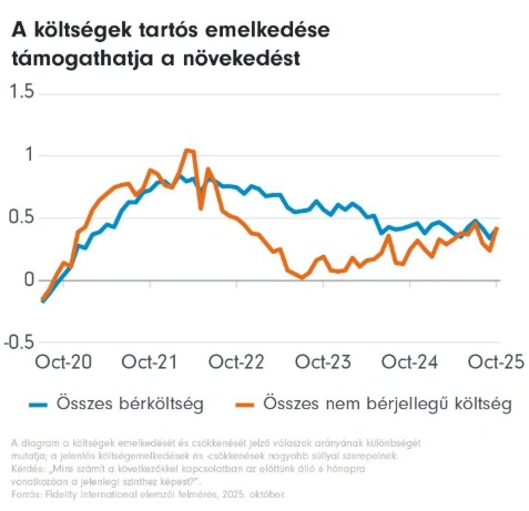 A kamatok csökkenésével a finanszírozás hozzáférhetőbbé és olcsóbbá válik, az alacsonyabb kamatkörnyezet és a vállalkozásbarátabb szövetségi kormányzati politika 2026-ban is támogató hátteret teremt a vállalatok számára. A Fidelity elemzői arra számítanak, hogy a költségnövekedés üteme a következő hat hónapban stabil maradhat, ami kedvezően hathat a vállalati eredményességre.
