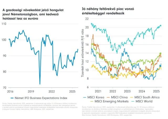 A dollár gyengülése különösen kedvez a feltörekvő piacoknak. A Fidelity elemzőinek egyik legerősebb meggyőződése 2026-ra a feltörekvő piaci részvényekhez kapcsolódik. Dél-Korea és Dél-Afrika fundamentális mutatói javulnak, értékeltségük pedig továbbra is kedvező. Kína kilátásait is pozitívan látják, köszönhetően a folyamatos szakmapolitikai támogatásnak.