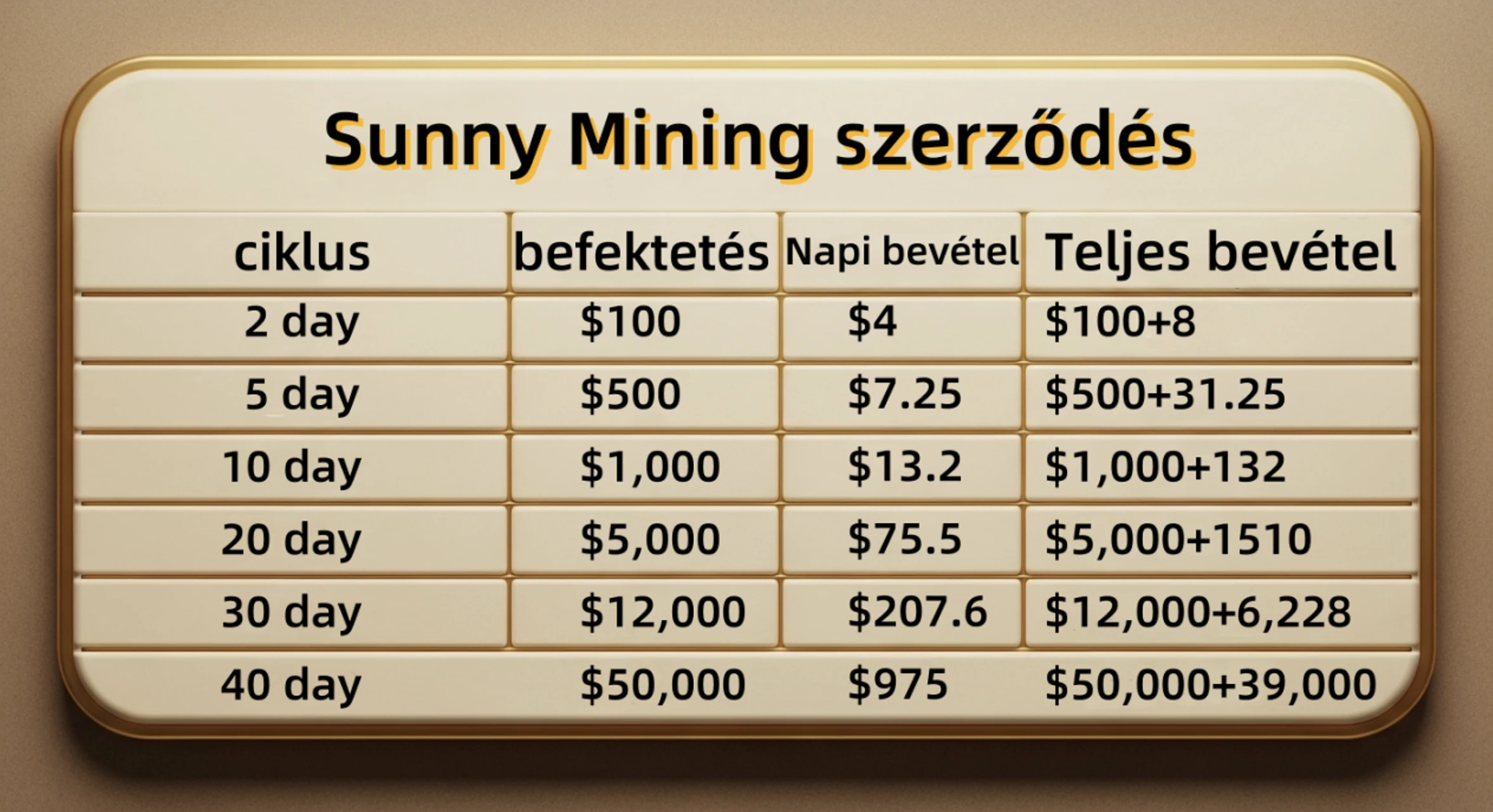 A rendszer automatikusan elszámolja a profitot naponta, a profitot közvetlenül a számlájára utalva. A profitját bármikor kiveheti, vagy új szerződésekbe fektetheti be az összetett növekedés érdekében.