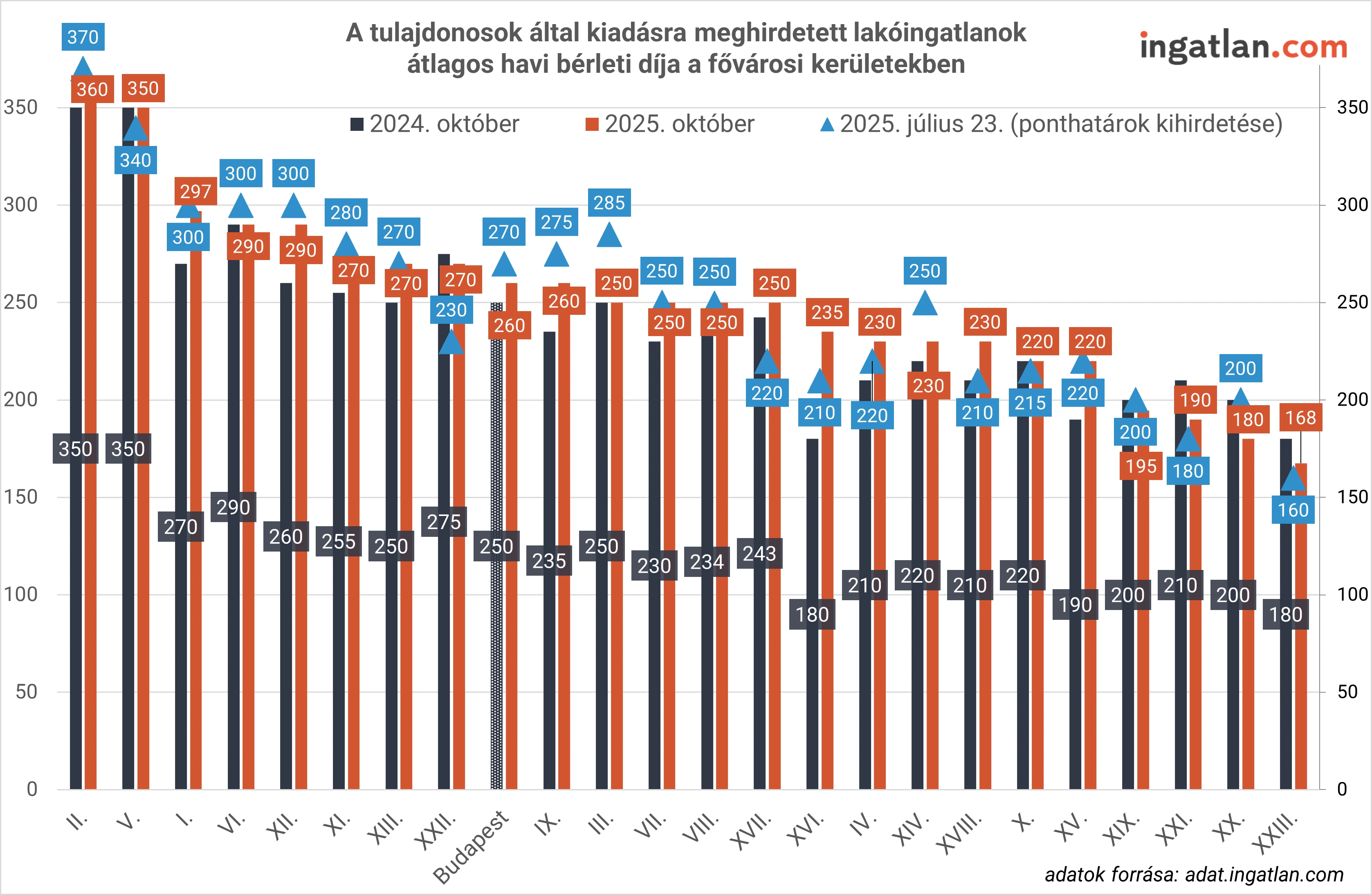 Az ingatlan.com elemzéséből kiderül, hogy mik a legfrissebb, kiadó lakásokat és házakat jellemző bérleti díjak október közepén. A fővárosi piac albérletárainak középértéke 260 ezer forintnál jár októberben, ami 10 ezer forinttal elmarad a júliusi szinttől, amikor kihirdették a felsőoktatási felvételi ponthatárokat. Az albérletszezon kezdete óta történt árcsökkenés a III., a XIV. és a XXII. kerületekben volt a legnagyobb, ahol 35, illetve 20 ezer forinttal csökkent a kiadó lakások bérleti díjainak középértéke. A XI., XII., a II., VI., kerületekben is 10 ezer forinttal csökkentek az átlagos bérleti díjak július végéhez képest, a IX. kerületben pedig 15 ezer forinttal. A budapesti kiadó lakások átlagos bérleti díjait tekintve szembetűnő változás, hogy október közepén mindössze már csak két kerületben jár 300 ezer forintos szint fölött a kerületi átlagos albérletár – az V. kerületben 350 ezer forint, a II.-ban pedig 360 ezer -, míg július végén még öt városrész medián lakbérei jártak legalább ennél ez árszintnél. A legolcsóbb budapesti kerület a XXIII., ahol 167 ezer forint a kiadó lakóingatlanok bérleti díjának a középértéke.