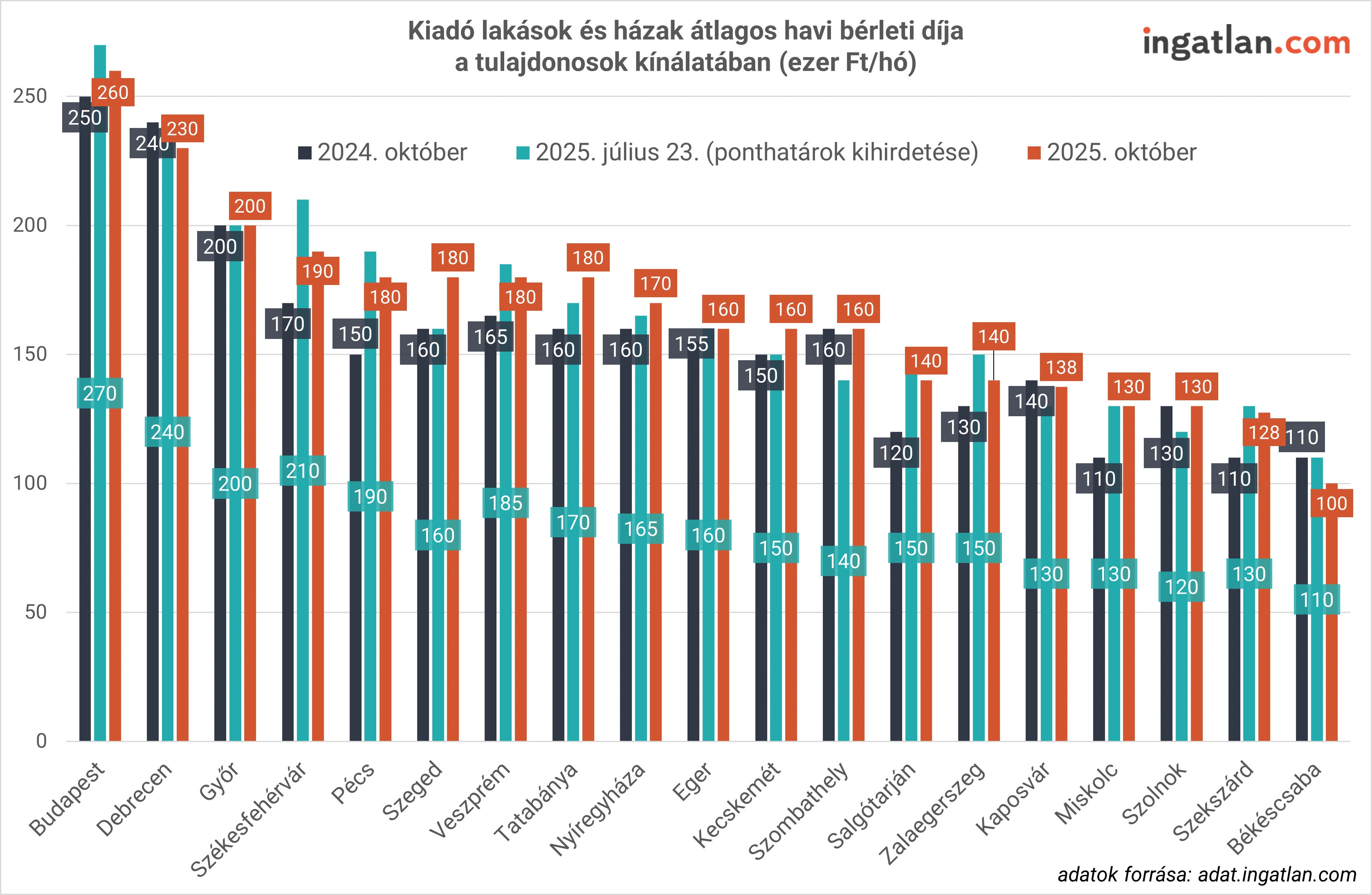 A bérleti díjak változatos képet mutatnak a legnagyobb egyetemvárosokban. Szegeden az utóbbi három hónapban 20 ezer forinttal 180 ezer forintra emelkedtek a kiadó lakóingatlanok átlagos albérletárai. Ugyanakkor Debrecenben 10 ezer forinttal 230 ezerre csökkentek, Pécsen pedig ugyanekkora összeggel 180 ezer forintra mérséklődött az átlagos bérleti díj. Székesfehérváron 20 ezer forinttal mérséklődött az albérletárak középértéke, ahol jelenleg 190 ezer forintért lehet átlagosan lakóingatlant kibérelni. Győrben és Egerben stagnálás figyelhető meg 200 ezer és 160 ezer forintos középértékkel. A legolcsóbb vármegyeszékhelyek az albérletpiacon Szolnok és Miskolc, ahol 130 ezer forint az átlagos albérletár.