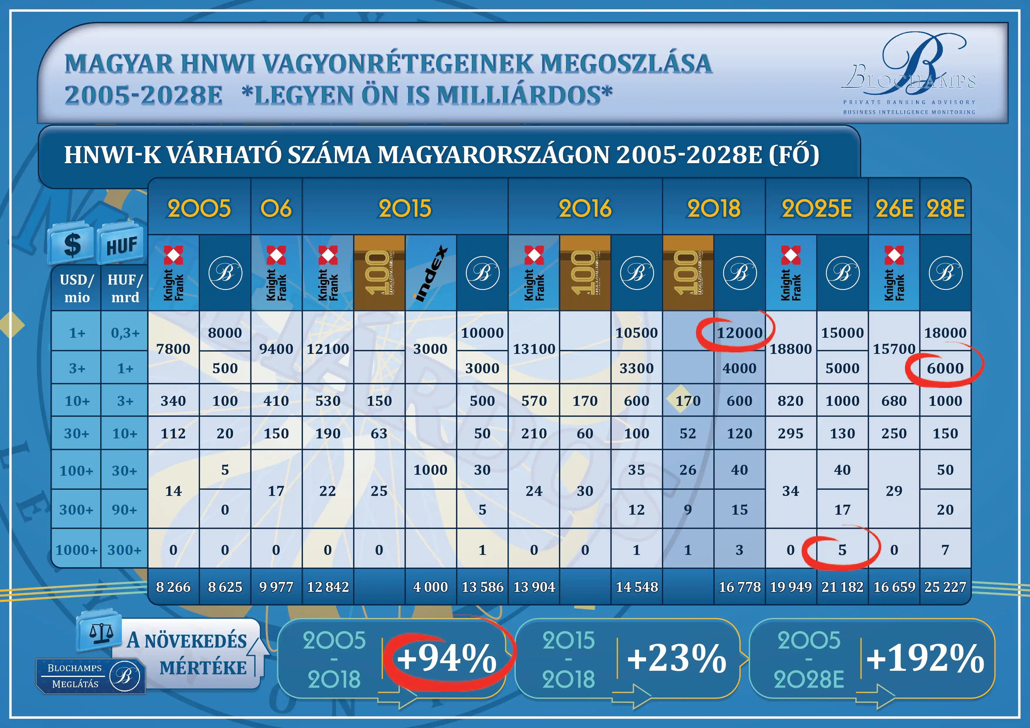 A Blochamps Capital friss elemzése szerint ma már nagyjából 7000-10.000 magyar rendelkezik legalább 1 milliárd forintos klasszikus pénzügyi vagyonnal, 30.000 fő rendelkezik egymilliárdot meghaladó teljes vagyonnal, számuk pedig 2030-ra ötödével nőhet.