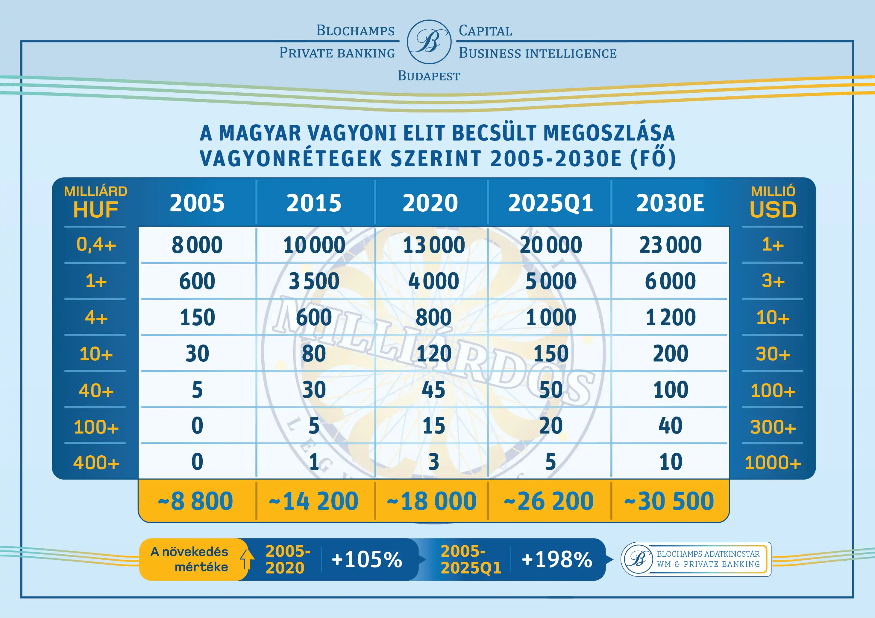 A Blochamps adatai szerint a 400 millió forint feletti klasszikus pénzügyi vagyonnal bíró gazdagok köre 2020 és 2025 között nagyjából 10.000 fővel bővült, nagyobbat ugorva, mint a megelőző 15 évben együttvéve.
