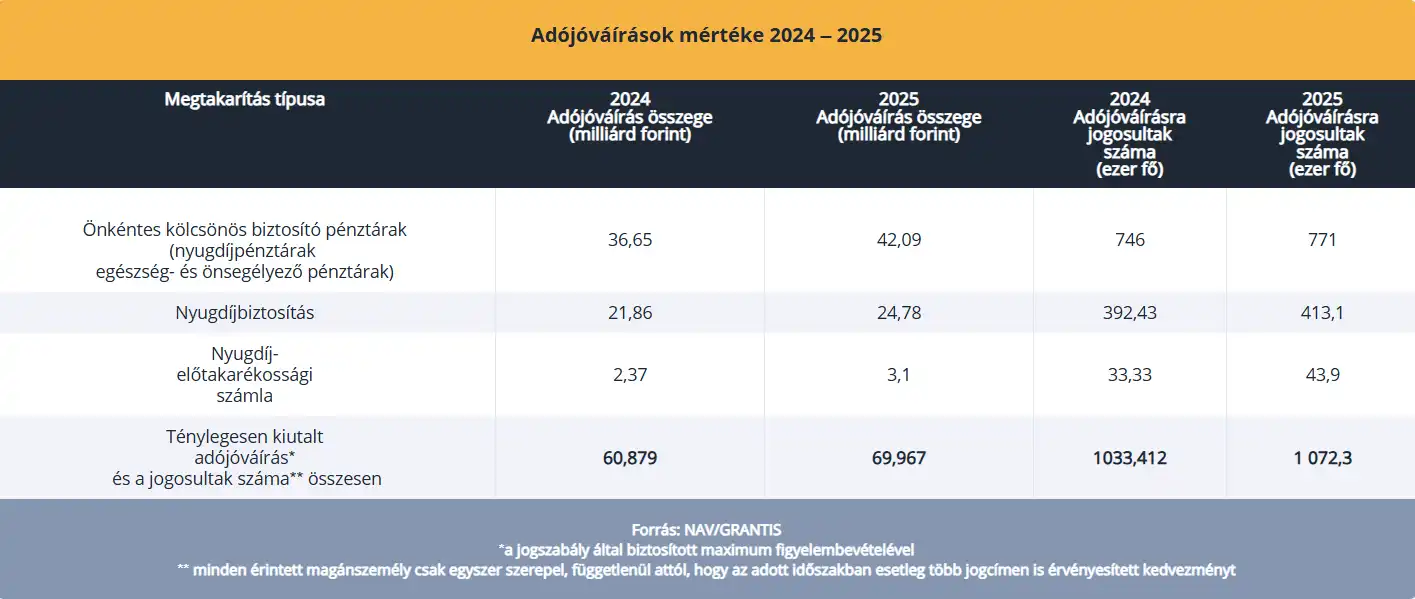 Idén 69,9 milliárd forintos adójóváírást érvényesíthetett az az 1 millió 72 ezer fő, aki nyugdíj megtakarításban, illetve egészség- és önsegélyező pénztárban takarékoskodott tavaly – közölte Nemzeti Adó- és Vámhivatal (NAV) a Grantis megkeresésére. Ez 9 milliárd forinttal több tavalyhoz képest.