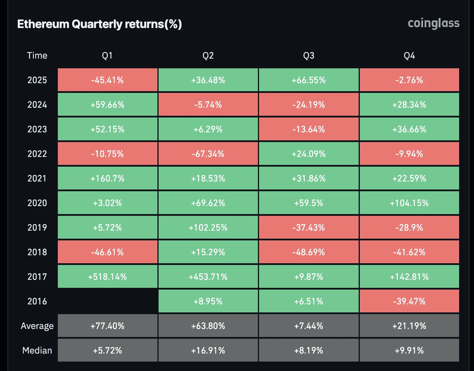 A történelmi adatok azt mutatják, hogy az Ethereum 2016 óta átlagosan 21,36%-os hozamot ért el a negyedik negyedévben, ami év végére körülbelül 5 000 dolláros árfolyamot vetítene előre – ez pedig jóval elmarad Lee és Hayes célértékeitől. Egyes elemzők, például James Harris, a Tesseract vezérigazgatója, jóval szerényebb, 6 500 dolláros szintet jósolnak decemberre.
