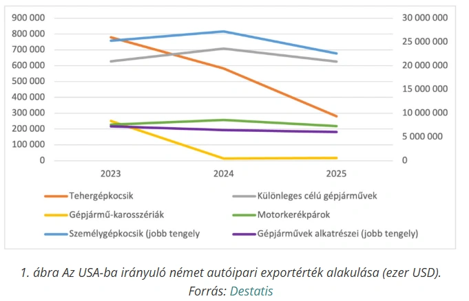 A német járműipari export az USA felé 2023-ban még 10,33 milliárd USD (ezer USD-ben: 10 327 286) értéket képviselt. Ez 2024-re 8,51 milliárd USD-re csökkent, ami –17,6%-os visszaesés. 2025-re a kivitel tovább zsugorodott 7,42 milliárd USD-re, ami újabb –12,7%-os csökkenés, így a teljes visszaesés két év alatt elérte a –28,1%-ot.