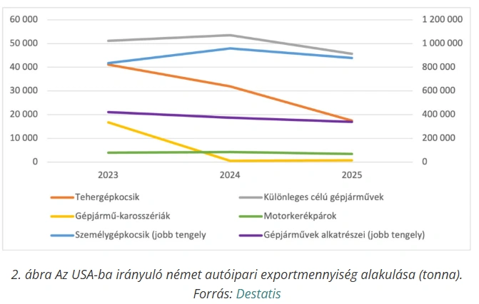 Mennyiségi alapon hasonló tendencia rajzolódik ki: a legnagyobb súlyú termékkategória, a személygépkocsik exportja folyamatosan csökkent, ami azt jelzi, hogy nem pusztán árváltozásról vagy termékösszetétel-eltolódásról van szó, hanem tényleges piaci kiszorulásról. Az alkatrészek exportjának visszaesése ráadásul arra utal, hogy a német beszállítói láncok is veszítenek amerikai pozícióikból.