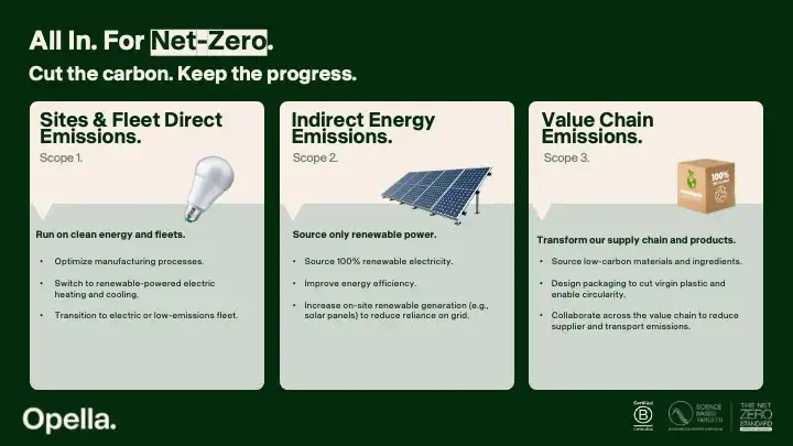 A célok eléréséhez az Opellánál a vállalati működés számos területén lesz szükség változásra; többek között az alacsony karbonlábnyomú alapanyagok beszerzése, a termékek csomagolásának újratervezése, a 100%-ban megújuló forrásokból származó villamosenergia használatra való átállás, valamint a beszállítókkal való együttműködés során. Az Opella évente beszámol a pozitív változásokról, és rendszeresen felülvizsgálja klímacéljait, hogy azok folyamatosan összhangban legyenek a klímatudomány fejlődésével.